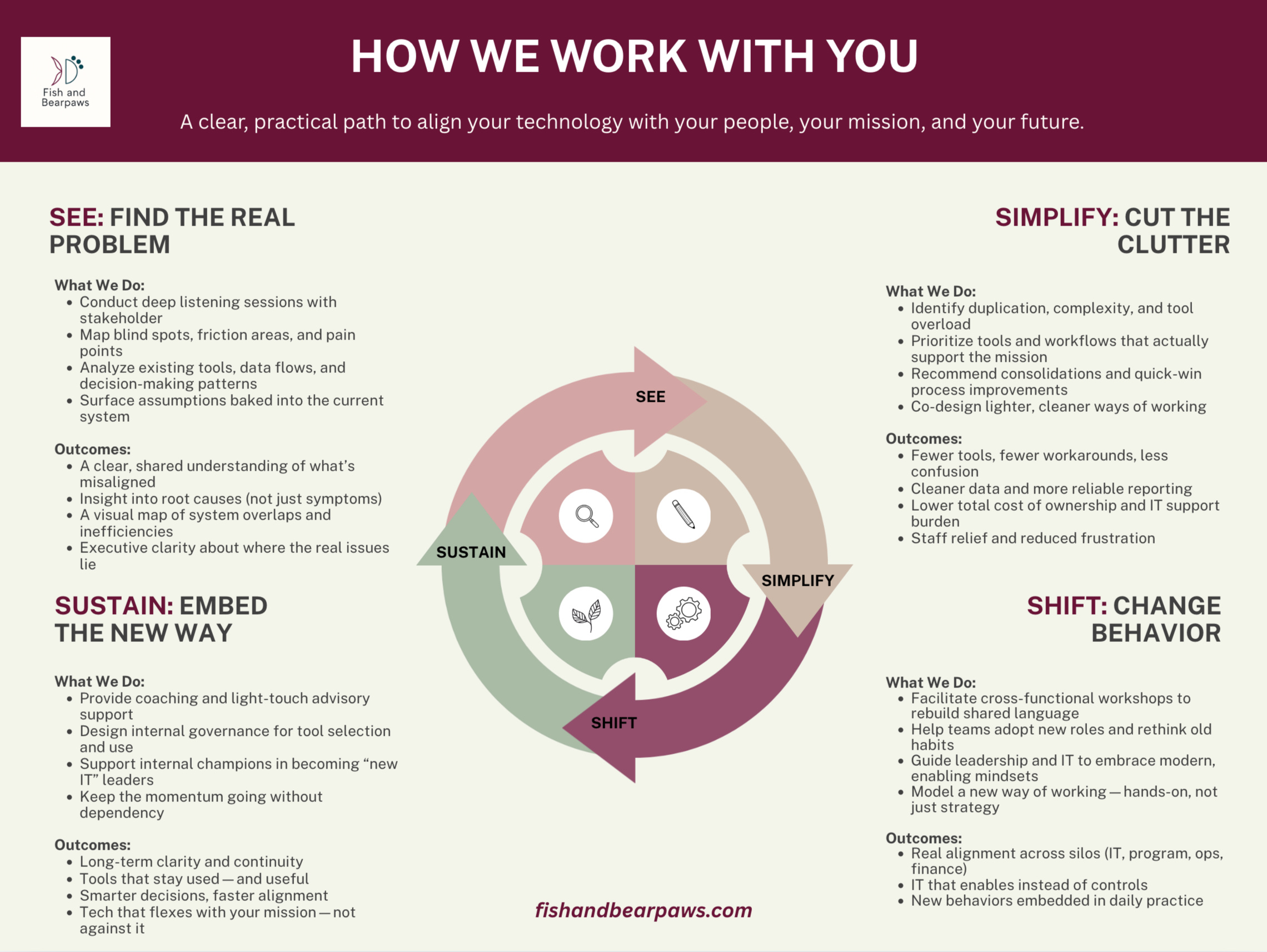 At Fish and Bearpaws, we help mission-driven organizations turn technology confusion into clarity—aligning systems with your people, purpose, and strategy.